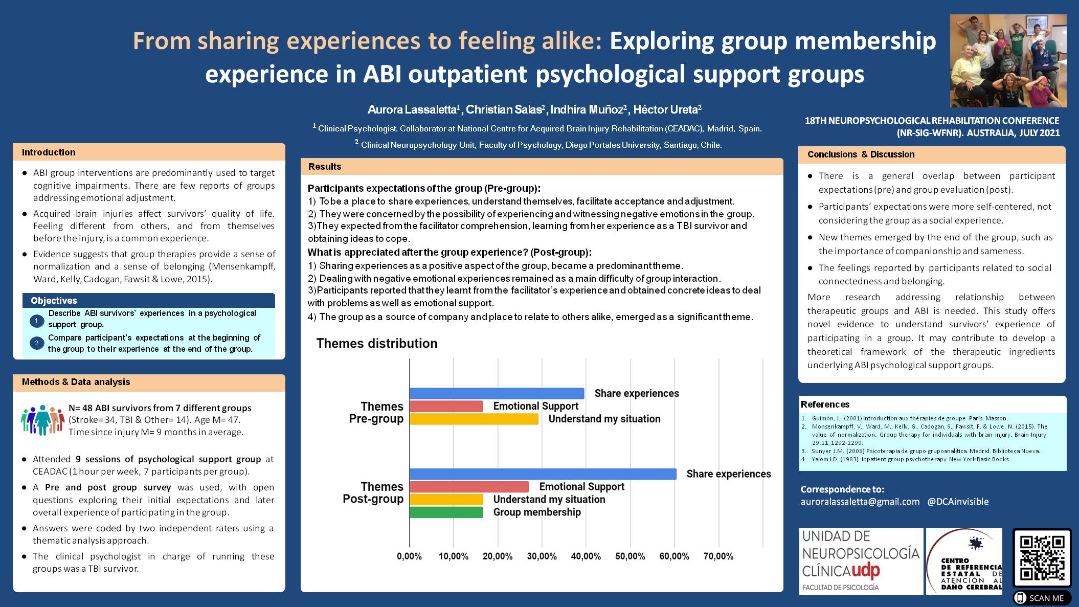 Estoy muy ilusionada con mi reciente participación, 5-6julio de 2021,como psicóloga clínica en el 18º Congreso Internacional de Rehabilitación Neuropsicológica (NIR-SIG-WFNR) con la presentación del póster «From sharing experiences to feeling alike: Exploring group membership experience in ABI outpatient psychological support groups».