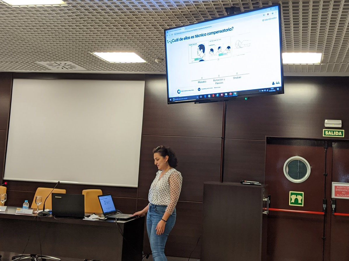 Laura Seco, logopeda de Ceadac, ofreció una ponencia interactiva con los asistentes y les hizo participar con una app que descargaron en sus móviles y que les permitió interactuar durante su intervención. “Prestemos atención a lo sensorial, a la sensibilidad, que es importante en la deglución. Tengamos en cuenta que en el paciente neurológico el reflejo de la deglución está retardado”, destacó.